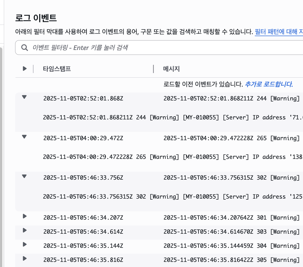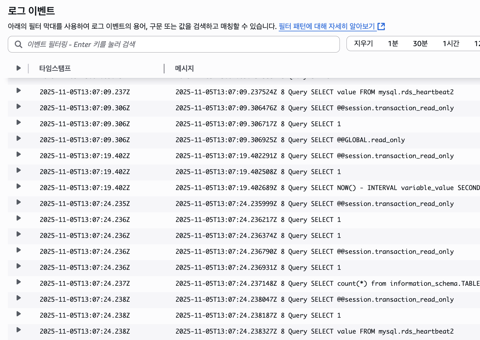 우선 slowquery 부터 살펴보면 로그 이벤트에 내가 실행한 쿼리문이 로그로 남겨져 있는것을 확인할 수 있었다.
